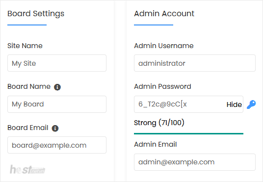 - Admin Username: Your new MyBB username (for security reasons, do not use the administrator or the admin username).