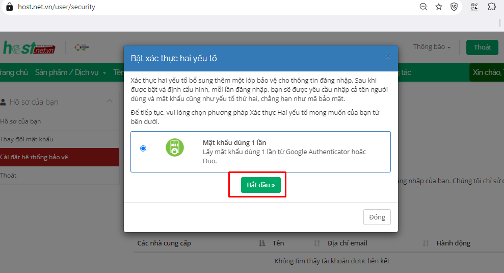 Bước 2: Giao diện yêu cầu thiết lập xác thực 2 yếu tố sẽ xuất hiện, nhấn vào bắt đầu.