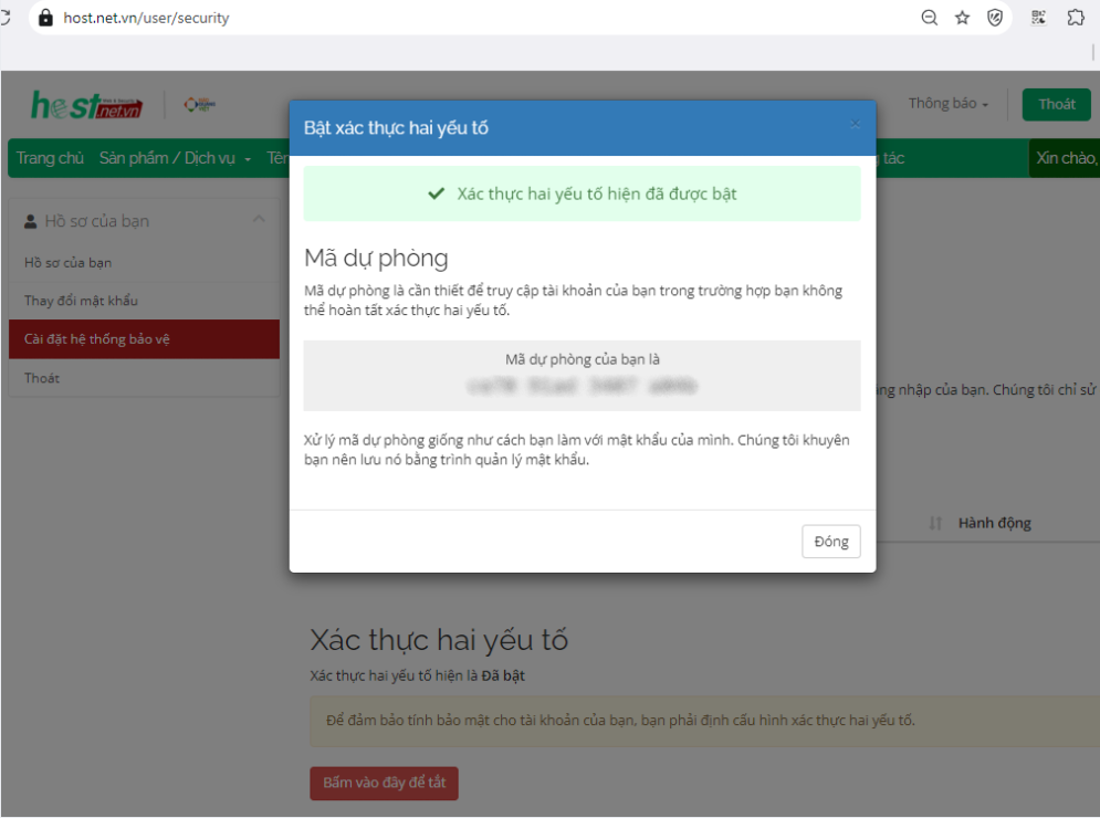 Bước 7: Thông báo như vậy là thành công, bạn có thể lưu mã dự phòng này để truy cập vào tài khoản trong trường hợp bạn không thể hoàn tất xác thực 2 yếu tố.
